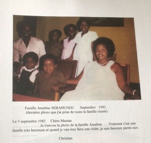 I was born in a family of seven, two parents and five siblings, though I should call it a family of eight to include a very close cousin Béata who we referred to as our sister in Rwanda’s family terms (her mum was my Aunt Marigarita Mukarwego, my mum’s only sister). She was a part of our family and she was living with us at the time I was born. I am one of the youngest being the fourth of five children. We had two naturally formed groups; big children and young children. There is four years difference between me and my older brother and a year gap between each of us. Within seven years, all five of us were born. From oldest to youngest; Uwonkunda Jacqueline Marcella, Dusenge Jeannette Claudine, Sebahungu Fidèle Olivier, Nyinawumuntu Uwamahoro Marie-Claire nicknamed Mimi (myself), Sebahungu Emile-Eric Ngirumpatse. Our cousin that I mentioned earlier Béatrice Mukamusoni that we did call Béa or Béata (short for Béatrice) lived with us until she was married when I was 9 years old.